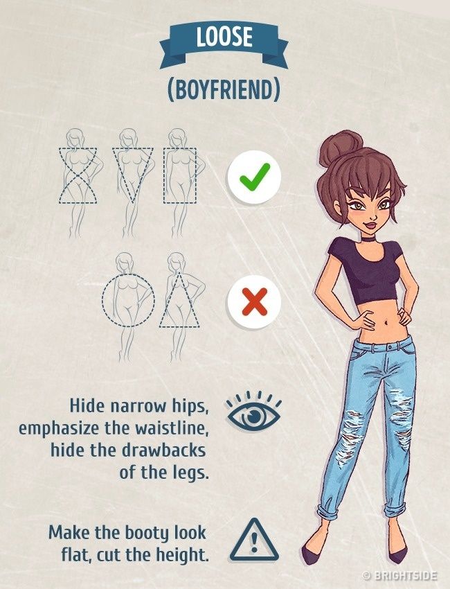 Τα χαλαρά τζιν τύπου boyfriend, φοριούνται από κοπέλες με σχήματα κλεψύδρας, ανάποδου τριγώνου και ορθογωνίου. Πρέπει να αποφεύγονται από σώματα με σχήμα κύκλου και τριγώνου. Αυτά τα τζιν κρύβουν την στενή περιφέρεια και δίνουν έμφαση στη μέση. Κρύβουν τη γραμμή των ποδιών. Επίσης, κόβουν το ύψος.