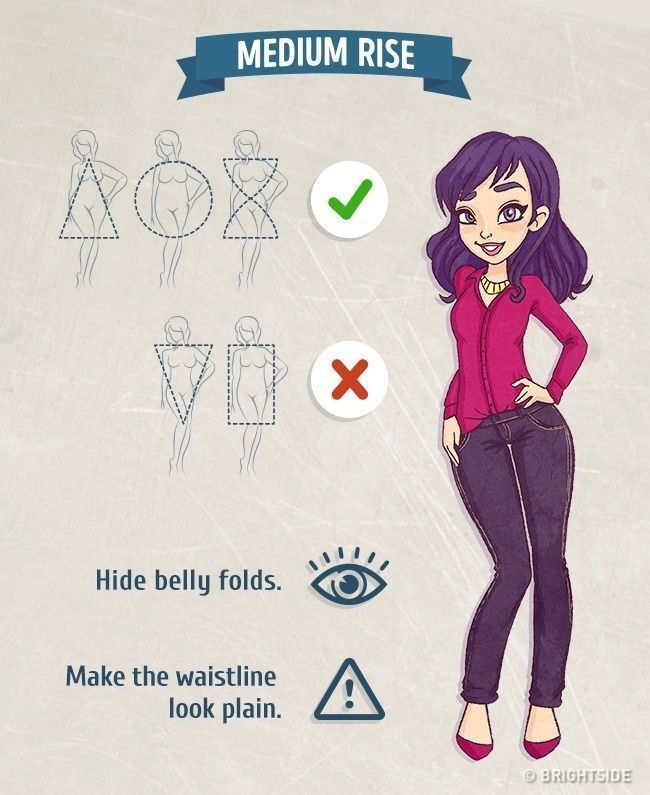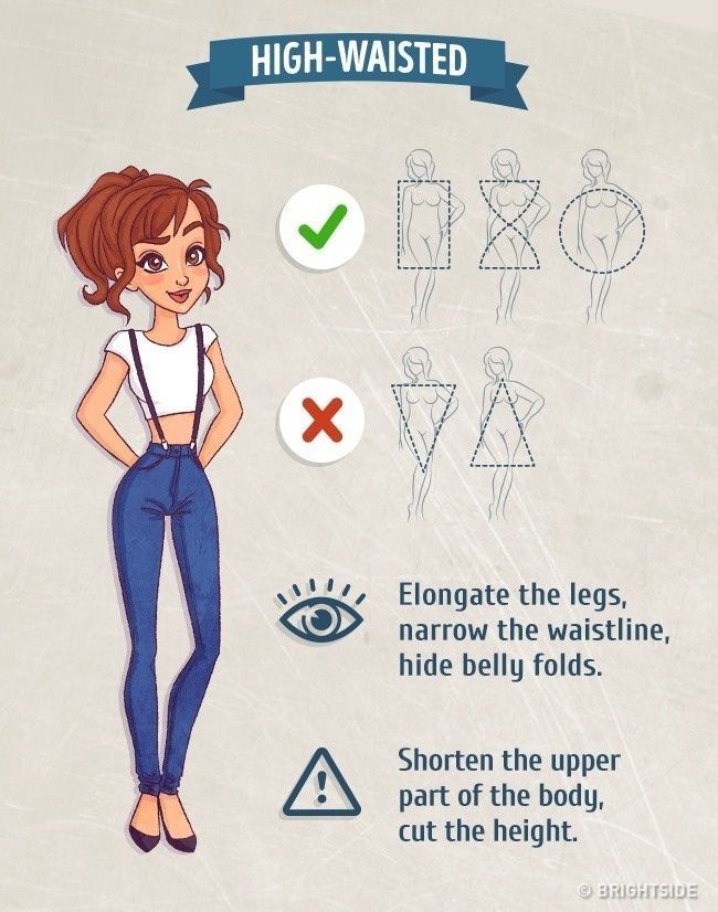 Τα ψηλόμεσα τζιν πρέπει να αποφεύγονται από τις κοπέλες με σωματότυπο τριγώνου και ανάποδου τριγώνου. Αναδεικνύουν τα πόδια και κρύβουν την κοιλιά.