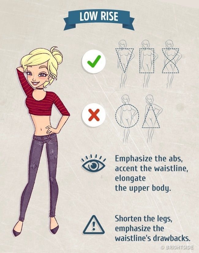 Τα χαμηλοκάβαλα τζιν, δεν είναι καλό να φοριούνται από κοπέλες με σώματα με σχήματα μήλου και τριγώνου. Τονίζουν τους κοιλιακούς και αναδεικνύουν τη μέση. Κονταίνουν όμως τα πόδια