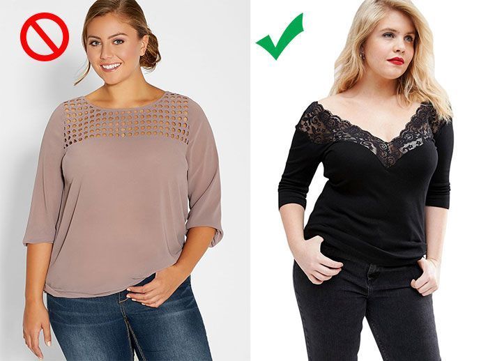 Οι μπλούζες με V λαιμόκοψη τείνουν να κάνουν τον κορμό σας να δείχνει πιο μακρύς. Επομένως, δημιουργεί την ψευδαίσθηση πως είστε πιο ψηλή και πιο αδύνατη. Αντιθέτως, οι μπλούζες με έξω τους ώμους και λαιμόκοψη χαμόγελου, κάνουν το σώμα σας να δείχνει πιο πλατύ και σας προσθέτουν κιλά. Αν λοιπόν θέλετε να κρύψετε τα παραπανίσια κιλά που διαθέτετε στον κορμό του σώματος σας προτιμήστε μια μπλούζα με V λαιμόκοψη.