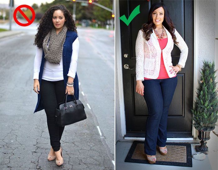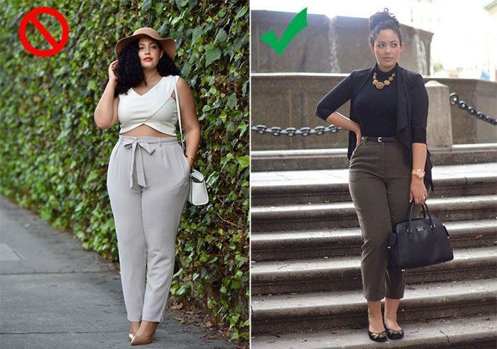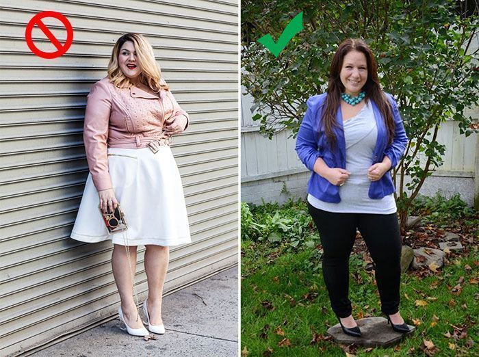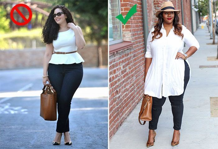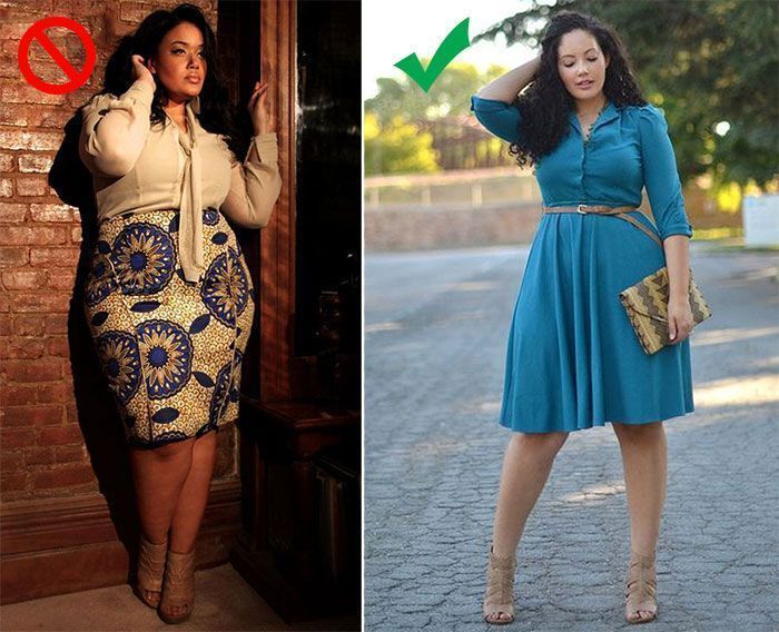 Τα ρούχα που είναι εφαρμοστά αποκαλύπτουν κάθε ατέλεια του σώματος, ενώ τα πιο φαρδιά τείνουν να την κρύβουν. Επομένως, η ιδανική επιλογή για γυναικεία ρούχα σε μεγάλα μεγέθη είναι φαρδιά κομμάτια στο μέρος του σώματος που θέλετε να κρύψετε και εφαρμοστά στα δυνατά σας σημεία, έτσι ώστε να τα τονίσετε. Πιο συγκεκριμένα, μια γυναίκα με μεγάλη περιφέρεια και λεπτό κορμό είναι προτιμότερο να φορέσει ένα φαρδύ παντελόνι με μια στενή μπλούζα. Ενώ οποία έχει λεπτά πόδια, αλλά πιο γεμάτο κορμό θα πρέπει να επιλέγει φαρδιές μπλούζες και skinny παντελόνια ή κολάν. Μια πολύ καλή επιλογή για να κρύψετε το γεμάτο πάνω μέρος του σώματος σας είναι και τα σακάκια.