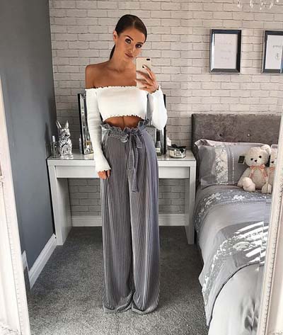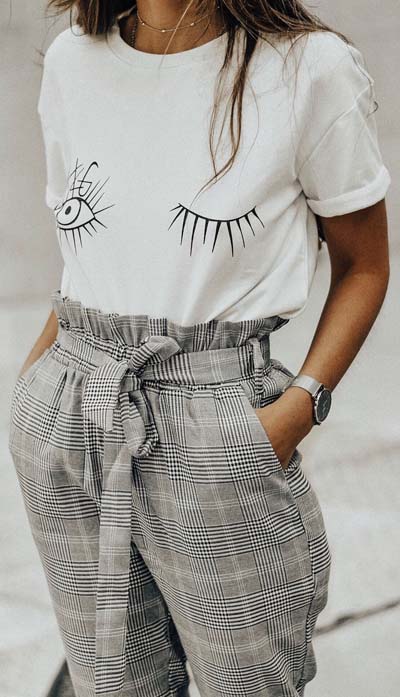 Η ιδιαιτερότητα του paper bag παντελονιού με το σούρωμα στη μέση και το δέσιμο με ζώνη, το κάνει πολύ εντυπωσιακό. Γι’ αυτό το λόγο, δεν χρειάζεται να το συνδυάζετε με ένα περίτεχνο μπλουζάκι. Η επιλογή ενός τοπ από μέσα ή ενός crop top είναι ιδανική.