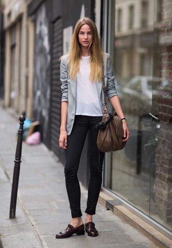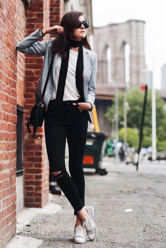 Μπορείτε να το συνδυάσετε με ένα απλό μαύρο μπλουζάκι και ένα τζιν. Είναι καλύτερα να επιλέξετε κάποιο στενό τζιν. Όσο για τα παπούτσια, είναι καλύτερα να προτιμήστε ψηλά τακούνια, σε μαύρο χρώμα. Είναι κομψά και ταιριάζουν με το περιβάλλον εργασίας.Επίσης, προσθέτουν μια σέξι πινελιά και έξτρα θηλυκότητα στο ντύσιμο μιας γυναίκας. Από την άλλη αν δεν μπορείτε τα ψιλοτάκουνα, επιλέξτε ένα φλατ παπούτσι, ή ankle boots, ακόμη και sneakers, αν το επιτρέπει ο χώρος εργασίας σας.