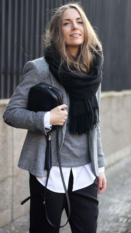 Το επόμενο σύνολο είναι και πάλι τέλειο για το γραφείο, κυρίως λόγω των σκούρων χρωμάτων του, αφού αυτά τα χρώματα είναι κατάλληλα για περιβάλλον εργασίας. Μπορείτε να φορέσετε ένα μαύρο παντελόνι με ένα λευκό πουκάμισο. Και έπειτα μπορείτε να προσθέσετε στο σύνολο σας και ένα γκρι σακάκι.