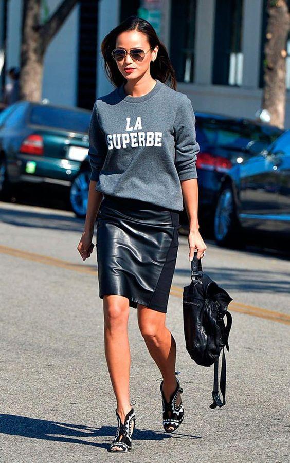 Αν σου αρέσει να παίζεις με την μόδα και να μπερδεύεις τα ρούχα της ντουλάπας σου, η εικόνα που θα δεις παρακάτω θα γίνει η αγαπημένη σου. Ένα καθημερινό μπλουζάκι και μια δερμάτινη πιο σικ φούστα. Extreme; Μπορεί. Μοντέρνο; Σίγουρα!