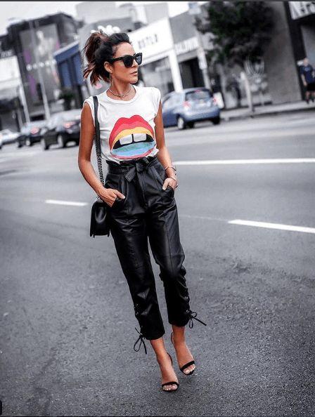 Αν είσαι από τις extreme προσωπικότητες, τότε η παρακάτω εικόνα είναι αυτό που σου ταιριάζει. Ένα δερμάτινο παντελόνι, που μπορεί να φορεθεί τόσο σε μια επίσημη όσο και σε μια καθημερινή εμφάνισή σου. Συνδύασε το με ένα t-shirt που έχει πάνω του μια άκρως νεανική στάμπα και είσαι έτοιμη!