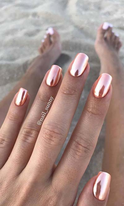 Ενδιαφέρον έχει και το μανικιούρ καθρέφτης που δημιουργείται με μια ειδική chrome σκόνη ή με μεταλλικά βερνίκια. Πέρα από το ροζ που ακολουθεί, το εφέ αυτό μπορεί να γίνει και με άλλα χρώματα.