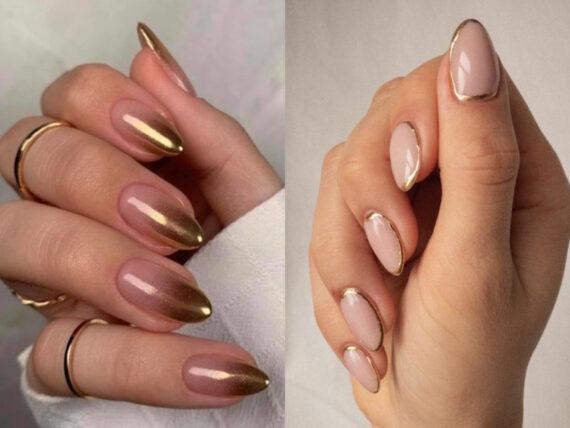 Διάλεξε τα μυτερά νύχια και επέλεξε μία nude απόχρωση στα χρώματα της επιδερμίδας σου για την βάση. Κάνε το μανικιούρ σου να ξεχωρίσεις με χρυσές άκρες, σαν μία πιο σικ και λαμπερή παραλλαγή γαλλικού μανικιούρ.