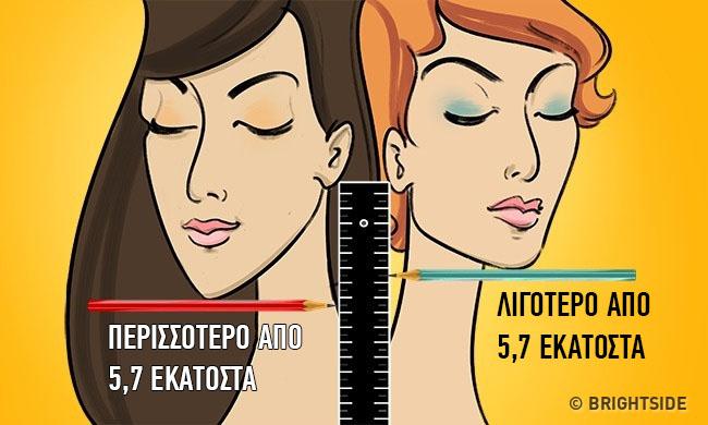 2. Μετρήστε την απόσταση από το κάτω μέρος του λοβού του αυτιού μέχρι το σημείο που τέμνονται ο χάρακας και το μολύβι. Αν το ύψος είναι λιγότερο από 5,7 εκατοστά, τότε το πρόσωπό σας είναι κατάλληλο για κοντό κούρεμα. Αν είναι μεγαλύτερο από 5,7 εκατοστά, τότε τα μακριά μαλλιά σας κολακεύουν περισσότερο.