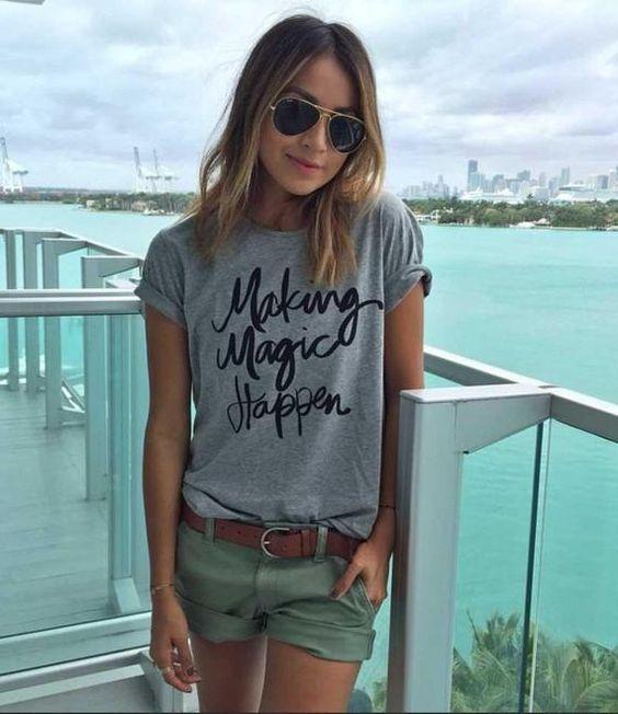 Ένα γκρι t-shirt συνδυάζεται άψογα με ένα χακί σορτσάκι! Είναι ένας πολύ ιδιαίτερος συνδυασμός χρωμάτων για τις γυναίκες που λατρεύουν τις σκούρες αποχρωσεις, αλλά δεν αντέχουν τα μαύρα χρώματα κατά τη διάρκεια του Καλοκαιριού. Απλά υπέροχο!