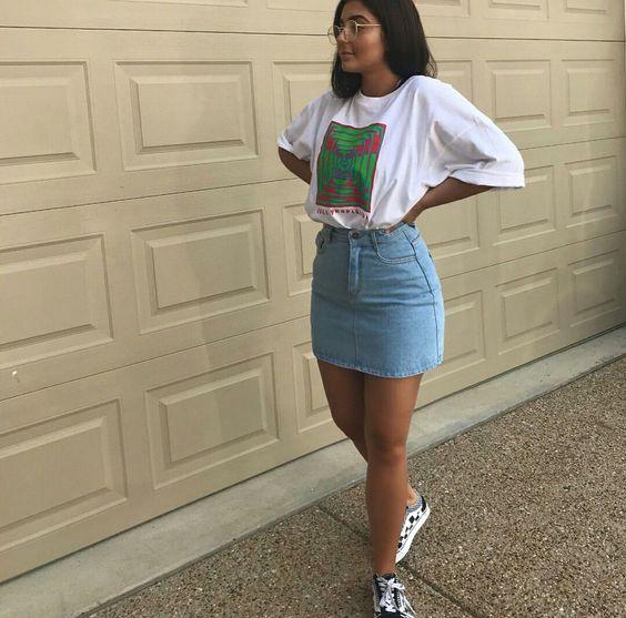 Ένα t-shirt με μια μοντέρνα και χρωματιστή στάμπα και μια jean mini φούστα σε ανοιχτές αποχρωσεις, είναι αυτά που χρειάζεσαι για να είσαι μοντέρνα σε έναν καφέ με τις φίλες σου κάποιο μεσημέρι! Ένα απόλυτα νεανικό ντύσιμο που έχει ενθουσιάσει τις περισσότερες γυναίκες του σήμερα.
