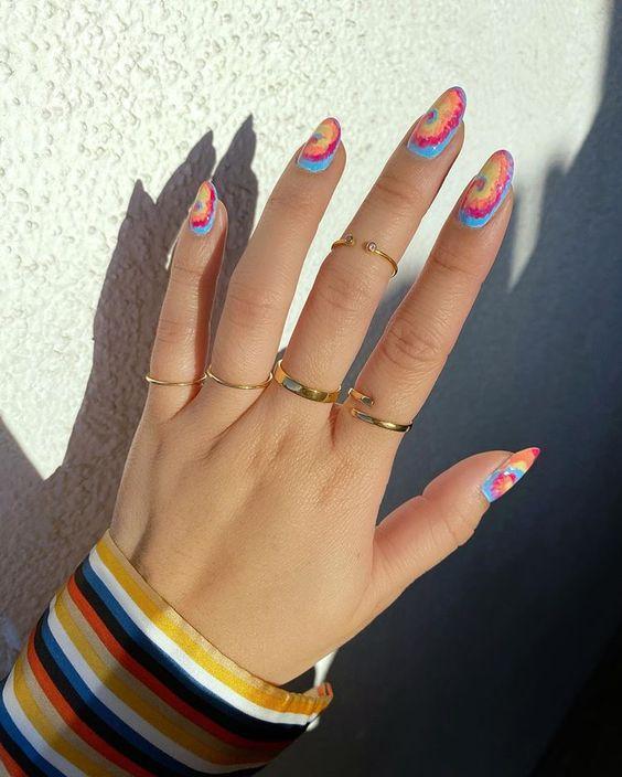 Το tie dye μανικιούρ, το αγαπήσαμε πολύ επειδή το κύριο χαρακτηριστικό του είναι τα χρώματα. Είναι εμπνευσμένο από την τάση των ’70s, όπου ήθελε τους νέους να φορούν ρούχα φαρδιά με πολλά χρώματα, τα οποία μπερδεύονταν μεταξύ τους!