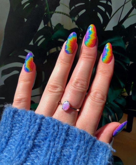 Αυτό που βλέπετε στην παρακάτω εικόνα, είναι ένα παραδοσιακό μανικιούρ tie dye. Είναι ακριβώς σαν τα σχέδια που επέλεγαν οι νέοι του ’70 για τα ρούχα τους! Αν θέλεις λοιπόν να υιοθετήσεις πλήρως την νέα τάση, τότε μπορείς να διαλέξεις το παρακάτω σχέδιο. Είναι νεανικό, είναι μοντέρνο και φυσικά πολύχρωμο! Εμείς το αγαπήσαμε!