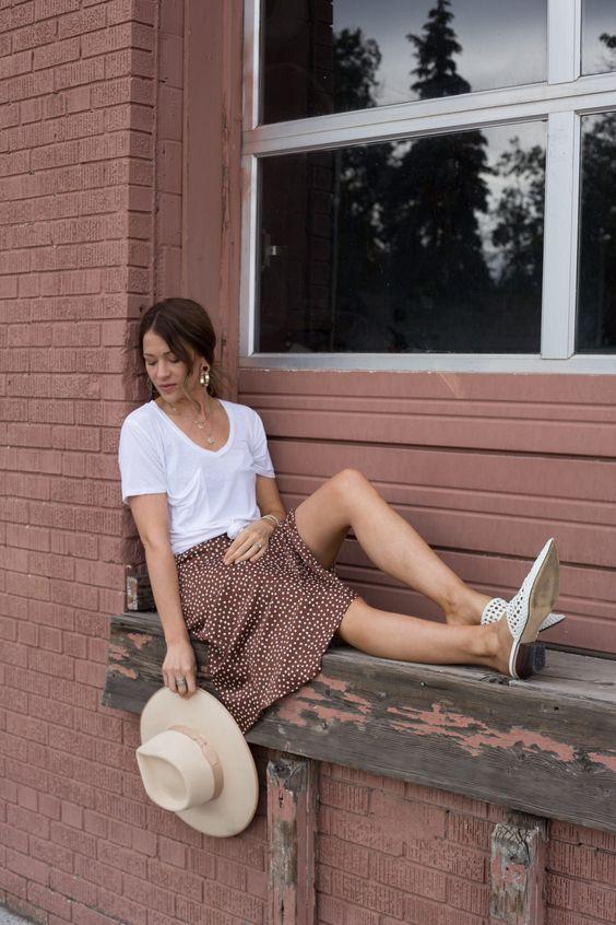 Ένας casual συνδυασμός που μπορείς να τον επιλέξεις είτε στις υποχρεώσεις σου στο κέντρο, είτε στις βόλτες σου στο…νησί είναι και ο παρακάτω. Μια πουά φούστα σε χρώμα σάπιου μήλου κι ένα λευκό t-shirt! Άνετο, safe και φυσικά πολύ μοντέρνο!