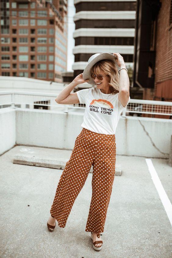 Κάθε γυναίκα έχει ανάγκη το Καλοκαίρι να έρχεται σε επαφή με τη boho πλευρά της. Η παρακάτω πουά παντελόνα σε συνδυασμό με το άκρως καλοκαιρινό t-shirt και το καπέλο, δημιουργούν την τέλεια boho εικόνα! Σε φανταζόμαστε ήδη σε κάποια εξοχή να απολαμβάνεις τον ήλιο φορώντας τα συγκεκριμένα ρούχα.