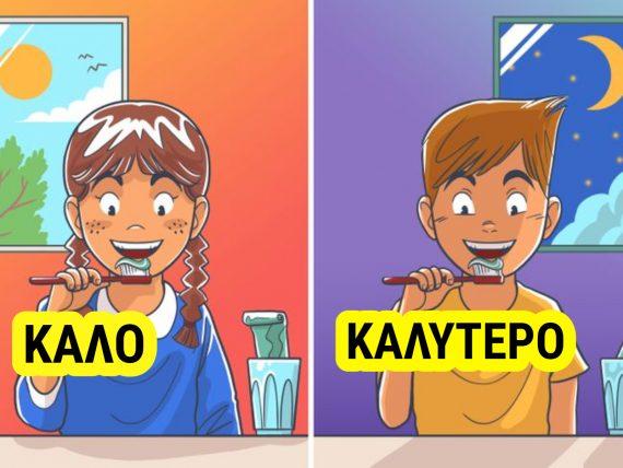 Το βούρτσισμα 2 φορές την ημέρα είναι σημαντικό, αλλά σε περίπτωση που μπορείτε να το κάνετε μόνο μία φορά, κάντε το πριν κοιμηθείτε. Κατά την διάρκεια του ύπνου δεν καταπίνετε και ξεπλένετε το στόμα σας και η παραγωγή σάλιου σας είναι αργή, οπότε η συσσώρευση πλάκας στα δόντια σας παραμένει στάσιμη και προκαλεί προβλήματα.