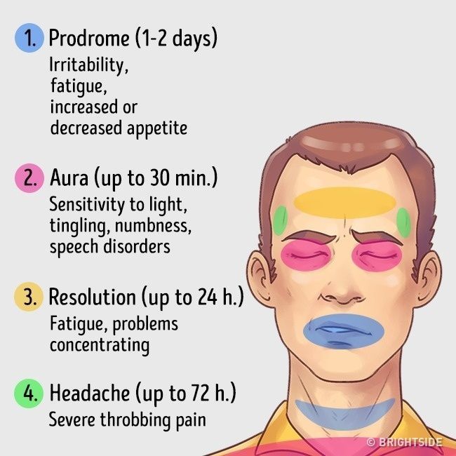 Όλα τα συμπτώματα αυτής της σοβαρής κεφαλαλγίας εξελίζονται σε τέσσερα βασικά στάδια.