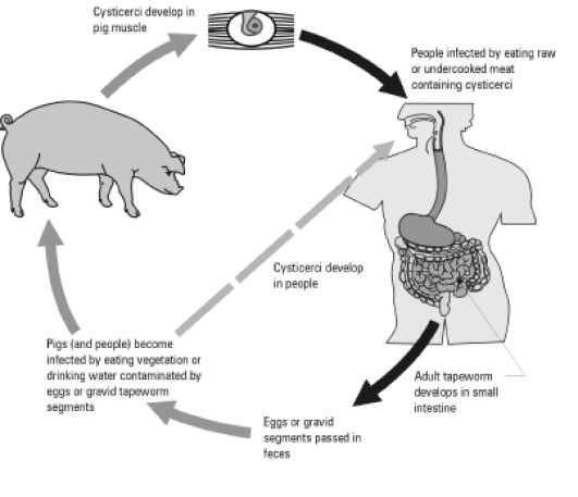 Αφού δεν τρώμε γάτες ή σκύλους, το παράσιτο δεν θα μπορούσε να μας ακουμπήσει εάν υπήρχε μόνο σ’αυτά τα ζώα. Υπάρχει όμως άλλο ένα ζώο που μπορεί να φιλοξενεί σκουλήκια και μας είναι πολύ οικείο – το γουρούνι.