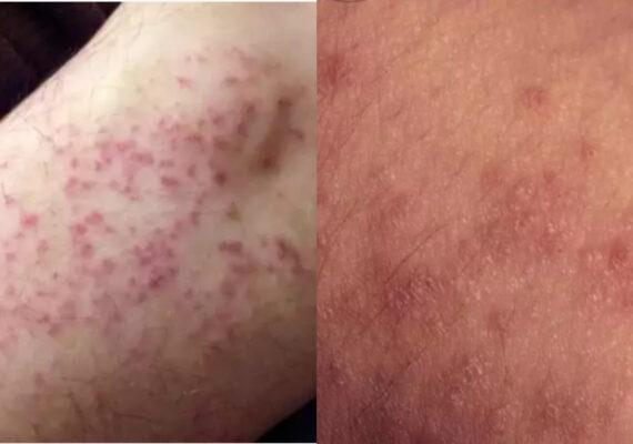 Το εξάνθημα αποτελείται από μικροσκοπικές κηλίδες, ή ανωμαλίες, που περιβάλλονται από μια περιοχή κόκκινου δέρματος. Οι κηλίδες μερικές φορές μοιάζουν με μικρές φουσκάλες και μπορεί να προκαλέσουν:
