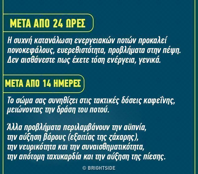 H εξάντληση μας χτυπάει την πόρτα στην μέση της εβδομάδας, 24 ώρες είναι πολύ λίγες για να προλάβουμε να κάνουμε τα πάντα και έτσι ξεκινάμε να ψάχνουμε τρόπους να αυξήσουμε την παραγωγικότητα και την απόδοση μας. Κάτι τέτοιο ακούγεται γνώριμο; Βρήκαμε τι συμβαίνει στο σώμα μας μετά την κατανάλωση ενός ενεργειακού ποτού και θα θέλαμε να μοιραστούμε μαζί σας το πραγματικό κόστος αυτής της δανεικής ενέργειας.