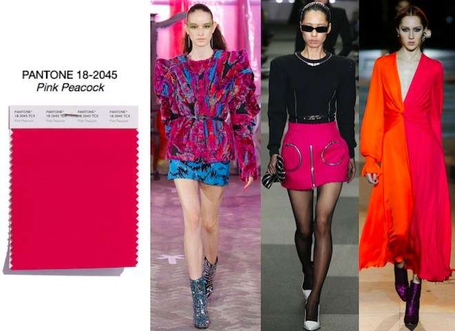 Μια λαμπερή και τολμηρή ροζ φούξια απόχρωση που δίνει μια πειραματική προσέγγιση στην παλέτα μόδας. Σε συνολική εμφάνιση ή με συνδυασμούς άλλων χρωμάτων, αυτός ο τόνος είναι πολύ ισχυρός και επιτρέπει τη δημιουργία outfits μεγάλης επίδρασης. Με το μπλε-πράσινο, το μπλε, το πορτοκαλί, το κόκκινο ή το παστέλ ροζ, στην πασαρέλα έχουμε δει να προσαρμόζεται σε όλους τους δυνατούς συνδυασμούς.