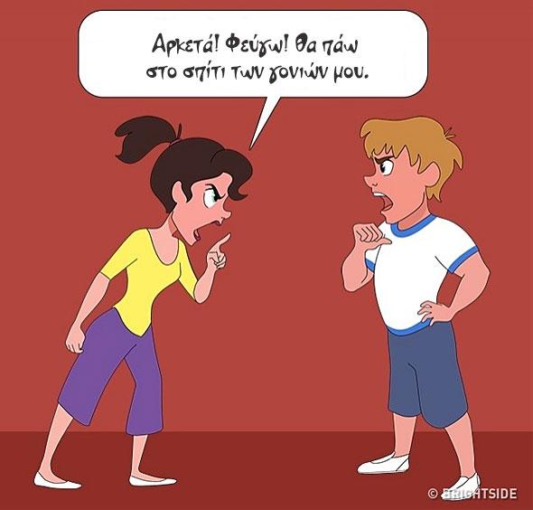 Όταν με την παραμικρή δυσκολία ή τον πρώτο καυγά λέτε στον σύντροφό σας ότι θέλετε να μείνετε μόνη σας ή τον απειλείτε ότι θα φύγετε από το σπίτι μόνο και μόνο για να σας ακούσει και να περάσει το δικό σας, στηρίζετε τη σχέση σας σε εκβιασμούς και απειλές. Αντιμετωπίστε το κάθε πρόβλημα που εμφανίζεται μπροστά σας βρίσκοντας πραγματικές λύσεις, χωρίς να έχετε στο μυαλό σας ότι πρέπει να «νικήσετε» και αυτή τη διαφωνία. Αν όντως χρειάζεστε χρόνο για να ηρεμήσετε, κάντε ένα μικρό «διάλειμμα» και συνεχίστε την συζήτηση χωρίς να φωνάζετε.