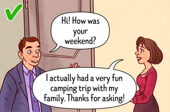 Επειδή οι άνθρωποι είναι συνηθισμένοι στο να χρησιμοποιούν την τεχνική της…κουβεντούλας για να “σπάσουν” τον “πάγο” προσπαθήστε να μην αγνοείτε αυτή τους την συνήθεια. Εάν πραγματικά αυτό σας κάνει να νιώθετε άβολα και ότι σπαταλάτε τον χρόνο σας, απλά προσπαθήστε η κουβεντούλα να είναι σύντομη. Μπορεί να αξίζει να αφιερώσετε χρόνο σε μερικούς ανθρώπους και οι κουβεντούλες μπορεί να καταλήξουν σε πολύ εποικοδομητικές συζητήσεις.