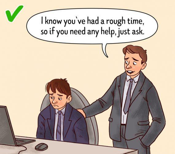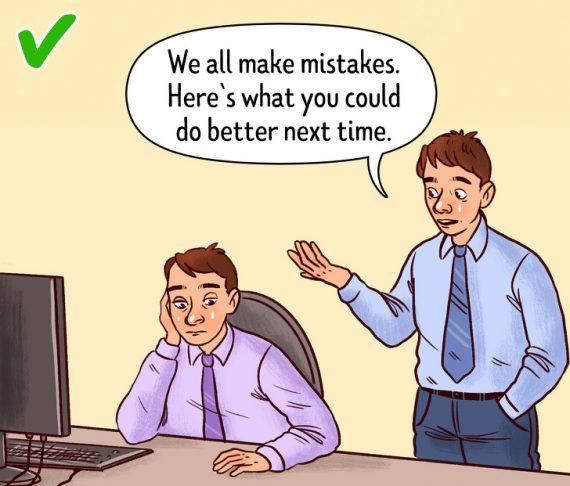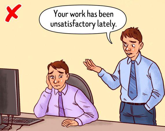 Παραδείγματος χάρη, αν έχετε κακά νέα για κάποιον θα μπορούσατε να τα πείτε ευθέως αλλά με έναν υποστηρικτικό τόνο. Ή αν πρέπει να επιπλήξετε κάποιον για την δουλειά του, τότε επικεντρωθείτε στις τωρινές του πράξεις και μην επεκταθείτε στα παλαιότερα λάθη του. Δείξτε του ότι ενδιαφέρεστε για τα καλά αποτελέσματα, και δώστε του συμβουλές για να βελτιώσει τη δουλειά του.