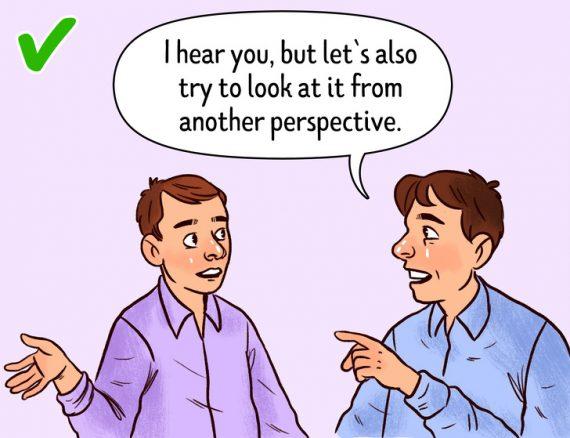 Στις περιπτώσεις όπου οι δικές σας απόψεις διαφέρουν με αυτές που εκφέρει ο συνομιλητής σας, εσείς προσπαθήστε να μην το πάρετε κατάκαρδα και να μην τον προσβάλλετε. Προσπαθήστε να “μπείτε” στα “παπούτσια” του και να εκφέρετε επιχειρήματα που συμφωνούν με τον τρόπο σκέψης σας αλλά θα μπορέσουν να πείσουν τον συνομιλητή σας.