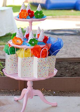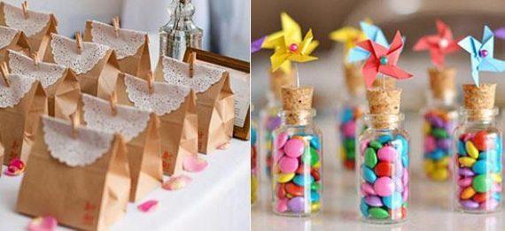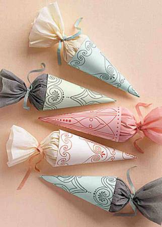 Τυλίξτε το χαρτί περιτυλίγματος όπως βλέπετε στη φωτογραφία κια στη συνέχεια συρράψτε το στην πάνω μεριά του. Διακοσμήστε το με αυτοκόλλητα σχέδια ή σχέδια με μανταλάκια και στο τέλος βάλτε σ’ ένα σακουλάκι από σελοφάν τα γλυκά και τοποθετήστε το μέσα. Αν θέλετε να ξεφύγετε από τα τετριμμένα, προτιμήστε να… σερβίρετε mashmellows ή σοκολατένιες ελίτσες.
