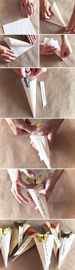 Κόβετε ένα τετράγωνο κομμάτι από το χαρτόνι, το διπλώνετε δύο φορές στη μέση και σχηματίζετε τις πλάγιες μεριές του, διπλώνοντάς τις ορθογώνια, όπως δείχνει το βίντεο. Έπειτα, σχηματίστε τριγωνικά την κάθε μεριά του και διπλώστε την προς τα μέσα. Ανοίξτε τα δύο πλαϊνά τρίγωνα και θα δείτε ότι θα έχουν σχηματιστεί ρόμβοι στη βάση του χαρτονιού. Τυλίξτε τις δύο ορθογώνιες πλευρές του, τσαλακώνοντας προσεκτικά τις άκρες του, και το χαρτί που περισσεύει διπλώστε το τριγωνικά προς τα μέσα. Για το καπάκι, ακολουθήστε την ίδια διαδικασία.