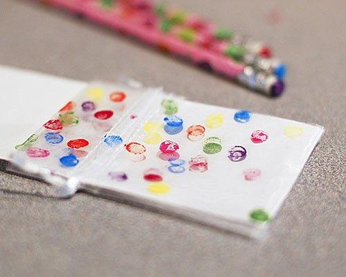 Με το πάνω μέρος ενός μολυβιού, κάντε πολύχρωμες τελείες στη σακούλα και τα διαφανή πουγκάκια. Αφήστε τα να στεγνώσουν και στη συνέχεια γεμίστε τα με τα κουφέτα. Έπειτα, τυλίξτε το πουγκί με γκοφρέ χαρτόνι, χωρίς να κόψετε όσο περισσεύει, έτσι ώστε να προεξέχει απ’ τη σακούλα.