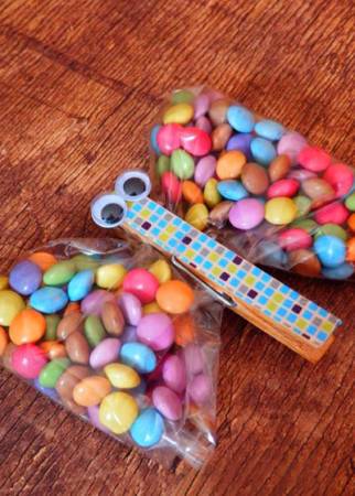 Διακοσμήστε το μανταλάκι όπως θέλετε, είτε με ζωγραφιές είτε κολλώντας πάνω του χάντρες, όπως στη φωτογραφία, και αφήστε το να στεγνώσει. Κολλήστε τα ματάκια χειροτεχνίας στην πάνω πλευρά του και -προαιρτικά- για τις κεραίες βάλτε δύο κομμάτια από σύρμα πίπας που θα κρύψετε στην τρύπα που σχηματίζει το μανταλάκι στο πάνω μέρος του. Στη συνέχεια, γεμίστε το σελοφάν με τα κουφέτα, στρίψτε το μια φορά και πιάστε το με το μανταλάκι έτσι ώστε να σχηματιστούν τα φτερά.