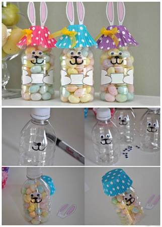 Αρχικά, ζωγραφίστε με ανεξίτηλο μαρκαδόρο το περίγραμμα του προσώπου του ζώου πάνω στο μπουκάλι και αφήστε το να στεγνώσει. Στη συνέχεια, κόψτε το χαρτόνι στο σχήμα των αυτιών και ζωγραφίστε το. Έπειτα, κάντε δύο λεπτές τρύπες με ένα κοπίδι στις ατομικές βάσεις για τα γλυκά και περάστε τα αυτιά από μέσα. Κολλήστε το αυτοσχέδιο καπέλο πάνω στο πλαστικό καπάκι και η μπομπονιέρα σας είναι έτοιμη!