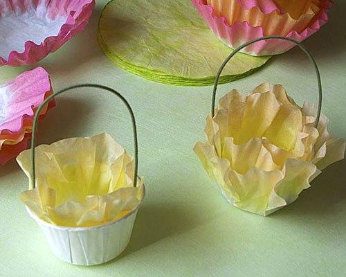 Στη συνέχεια, κολλήστε τρία μεγαλά φίλτρα μεταξύ τους και ντύστε με τα μικρότερα -και χρησιμοποιώντας λίγη κόλλα για να μην «ποτίσει» το χαρτί- τις χάρτινες βάσεις για τα γλυκά, εσωτερικά και εξωτερικά. Έπειτα, κολλήστε τα μεγάλα φίλτρα στη βάση του καλαθιού και τσαλακώστε τα για να πάρουν το σχήμα λουλουδιού. Τέλος, με λίγο μπλου τακ σταθεροποιήστε στα πλάγια του καλαθιού το σύρμα πίπας .