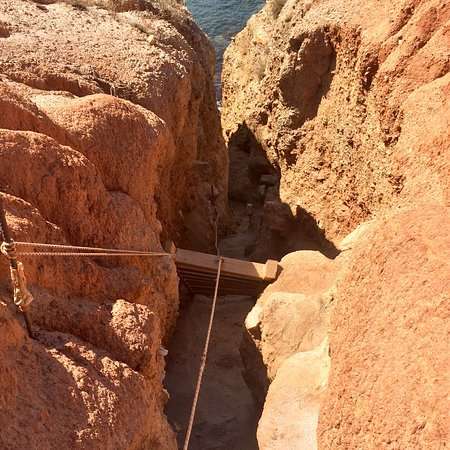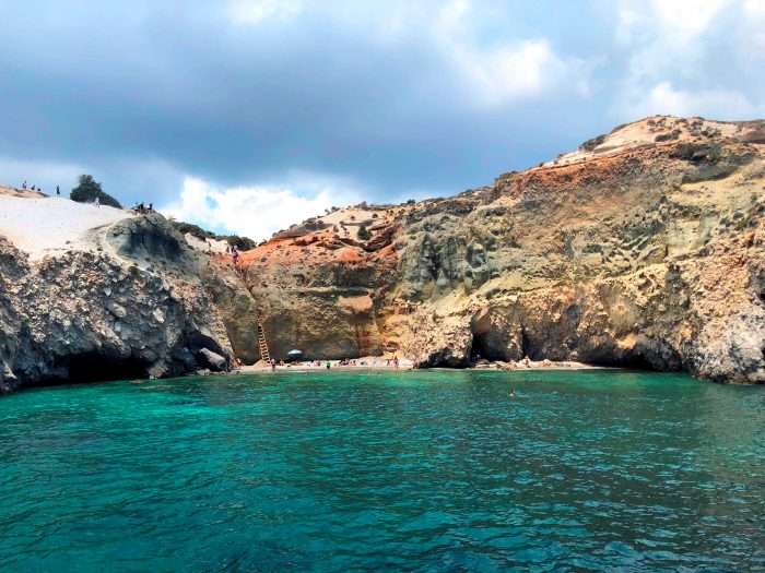 Η τεράστιου μήκους σκάλα που έχει τοποθετηθεί για την πρόσβαση στο συγκεκριμένο παραδεισένιο μέρος της Μήλου –την οποία κρατά ένα σκοινί!- αποτελεί ανασταλτικό παράγοντα για να απολαύσει κανείς τα γαλαζοπράσινα νερά.