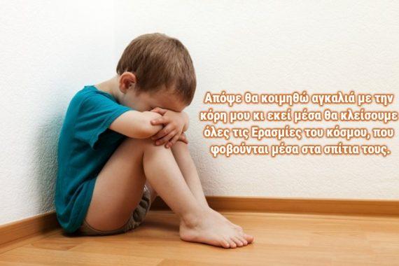 Ας κλείσουμε στις αγκαλιές μας τα παιδιά που στο σπίτι τους φοβούνται. Και πιστέψτε μας αυτά τα παιδιά που φοβούνται μέσα στο σπίτι τους είναι πολλά. Και η σιωπή μας, σημαίνει συνενοχή. Φοβόμαστε να απευθυνθούμε στους αρμόδιους, αφήνοντας αυτά τα παιδιά μέσα στη δυστυχία.