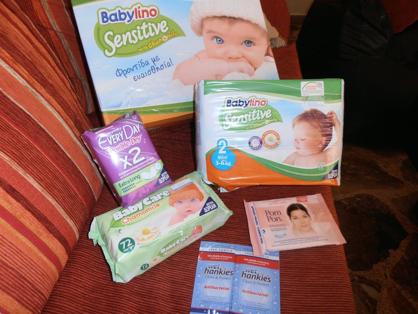 Περιέχει: ένα πακέτο πάνες το νούμερο 2, ένα πακέτο σερβιέτες, ένα πακέτο μωρομάντηλα, δείγματα από μαντηλάκια ντεμακιγιαζ και μαντηλάκια αντισηπτικά.