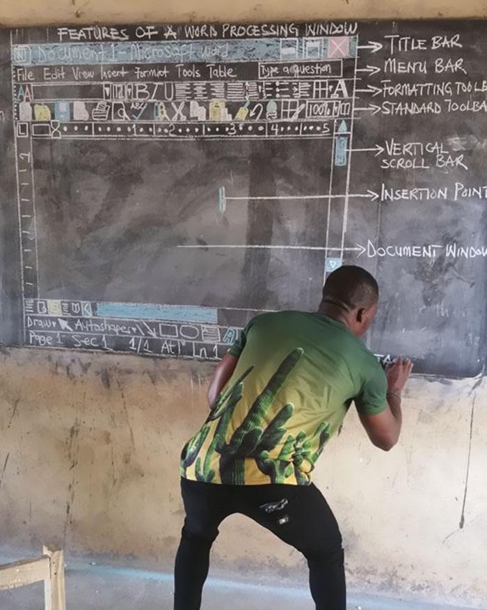 Όταν διδάσκει το πρόγραμμα Microsoft Word, σχεδιάζει ένα πλήρες στιγμιότυπο οθόνης στον μαυροπίνακα για να το αντιγράψουν και να το μάθουν οι μαθητές του