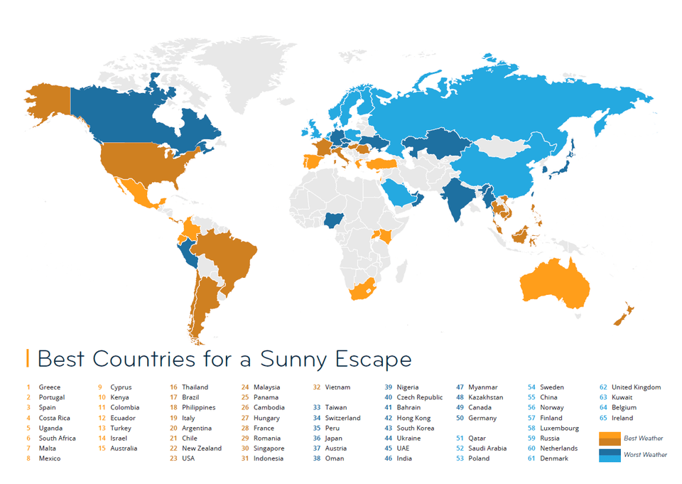 Η Ελλάδα ανέβηκε τέσσερις θέσεις από την προηγούμενη χρονιά, κατακτώντας την κορυφή. Στην πρώτη δεκάδα μετά την Ελλάδα ακολουθεί η Πορτογαλία, η Ισπανία, η Κόστα Ρίκα, η Ουγκάντα, η νότια Αφρική, η Μάλτα, το Μεξικό, η Κύπρος και η Κένυα. Σε οποιονδήποτε από αυτούς τους δέκα πρώτους προορισμούς, οι θετικές εκτιμήσεις για το κλίμα και τις καιρικές συνθήκες ανήλθαν τουλάχιστον στο 91%, δηλαδή κατά 30% πάνω από τον παγκόσμιο μέσο όρο. Στην έρευνα συμμετείχαν περισσότεροι από 12,500 ξενιτεμένοι σε 188 διαφορετικές χώρες.