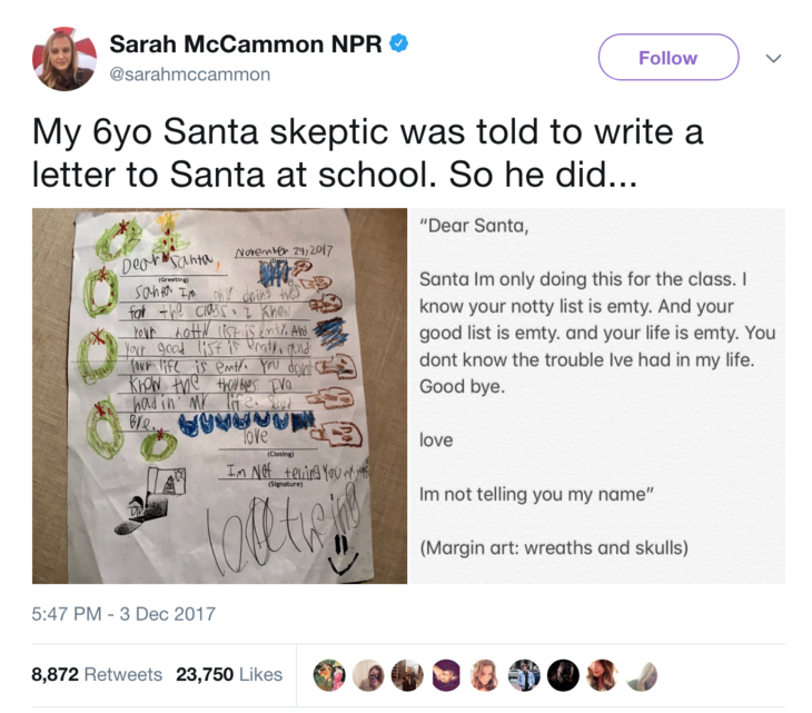 Ζητήθηκε στον 6 άχρονο γιο μου που είναι δύσπιστος να γράψει ένα γράμμα για τον Άγιο Βασίλη στο σχολείο, έγραψε η McCammon στο Twitter.