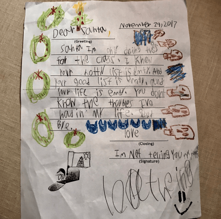 Το γράμμα αυτού του παιδιού έγινε viral και κέρδισε αμέσως το διαδίκτυο. Επίσης, λάτρεψαν το γεγονός οτι το παιδί θέλησε να διακοσμήσει το γράμμα του με χριστουγεννιάτικα στεφάνια και κρανία..