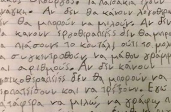 «Τα παιδάκια έχουν ανάγκη. Αν δεν κάνουν λογοθεραπεία δεν θα μπορούν να μιλούν. Αν δεν κάνουν εργοθεραπεία, δεν θα μπορούν να πιάσουν το κουτάλι ούτε το μολύβι να συγκεντρωθούν να μάθουν γράμματα και αριθμούς». Με αυτά τα λόγια μία μικρή μαθήτρια απευθύνεται στον αναπληρωτή υπουργό υγείας, Παύλο Πολάκη, στέλνοντας του γράμμα και θέλοντας να του εξηγήσει τι νιώθει και τι συνέπειες θα έχουν οι αποφάσεις του υπουργείου στα παιδιά ΑΜΕΑ.