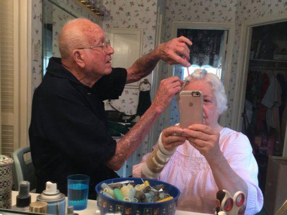 Η εικόνα μοιράστηκε στα social media από την Amy Pennington. Δείχνει τον παππού της να βοηθάει τη γιαγιά της στο φτιάξιμο των μαλλιών της, μετά την ανάρρωσή της από τη χειρουργική επέμβαση στον καρπό.