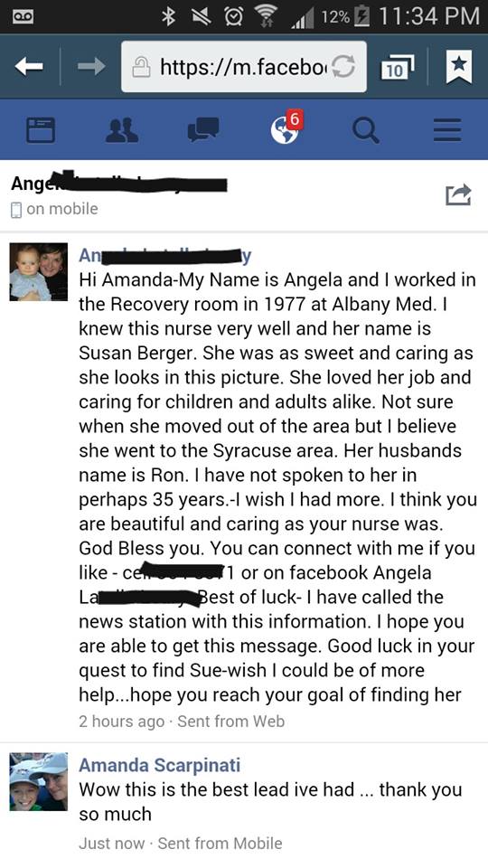 “Ήξερα αυτή τη νοσοκόμα πολύ καλά και το όνομά της είναι η Σούζαν Μπέργερ,” δήλωσε η Λίρι σε ένα σχόλιο στο Facebook κάτω από το post της Scarpinati. “Ήταν τόσο γλυκιά και τρυφερή, όπως ακριβώς φαίνεται σε αυτή την εικόνα. Αγαπούσε τη δουλειά της και φρόντιζε με αγάπη και τους ενήλικες και τα παιδιά … έχω να της μιλήσω ίσως και 35 χρόνια. Μακάρι να είχα περισσότερα να σου πω. Νομίζω ότι θα είναι τόσο όμορφη και στοργική όπως ήταν, όταν ήταν νοσοκόμα.”