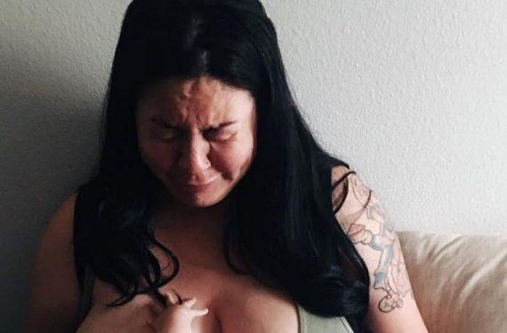 Η Tori ποζάρει στη φωτογραφία θηλάζοντας το μωρό της και κλαίγοντας.