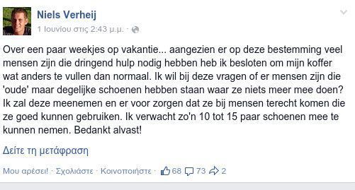 Οπως σημειώνει η ολλανδική ιστοσελίδα «AD.nl», το ζευγάρι πριν ξεκινήσει για το ταξίδι του προσκάλεσε μέσω Facebook γνωστούς και φίλους να τους δώσουν ρούχα και παπούτσια που δεν χρειάζονταν για να τα πάρουν μαζί τους στο ταξίδι τους στην Κω και να τα δώσουν στους μετανάστες που έχουν έρθει στο νησί.