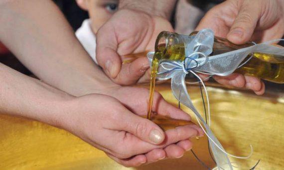 Αλείφει το μωρό με λάδι και έπειτα δίνει και στον νονο να το αλείψει . Πρέπει να αλειφθεί όλο . Μην διστάσετε να λαδώσετε παντού.