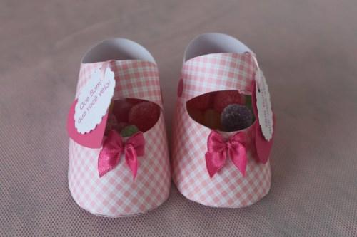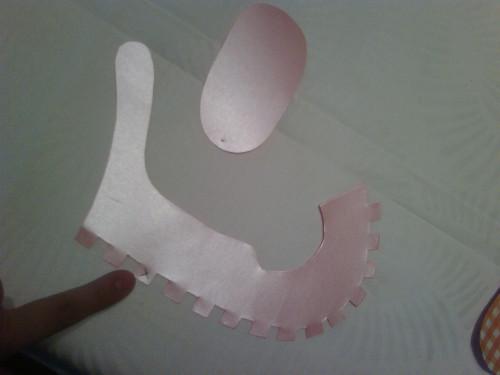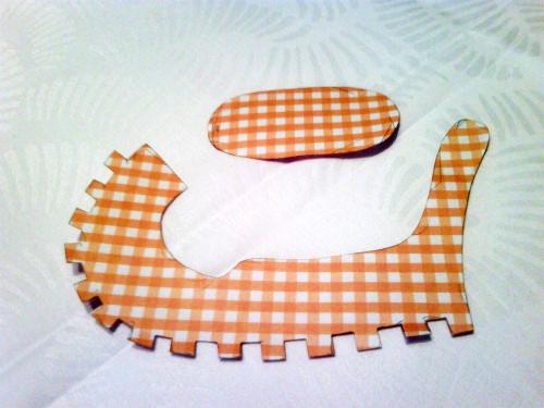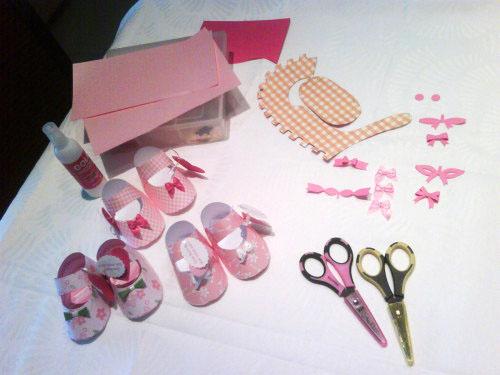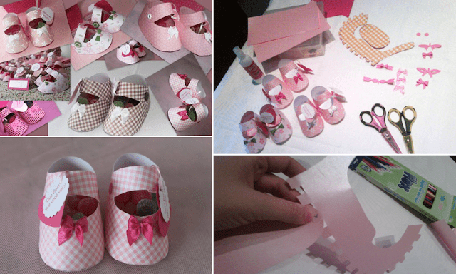 Σημειώστε την 3η εγκοπή του βασικού σχεδίου με χ και τη σόλα του παπουτσιού και κολλήστε εκεί (εικόνες 5-6-7). Βάλτε μια τελεία κόλλας σε κάθε εγκοπή και κολλήστε το παπούτσι. Μετά την ολοκλήρωση με την κόλλα το μόνο που χρειάζεστε είναι να τα διακοσμήσετε. Χρησιμοποιήστε φιογκάκια και κουμπιά. Καλή επιτυχία!