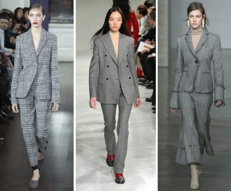 Το ανδρόγυνο κοστούμι είναι μια από τις τάσεις του φθινοπώρου. Αλλά αυτό που ξεχωρίσαμε είναι η ποικιλία σε γκρι κοστούμια. Το γκρι είναι επίσης ένα χρώμα που είναι στη μόδα τη φετινή σεζόν. Τα κοστούμια ποικίλλουν από πιο θηλυκό σε πιο αρσενικό στυλ.